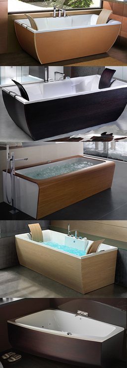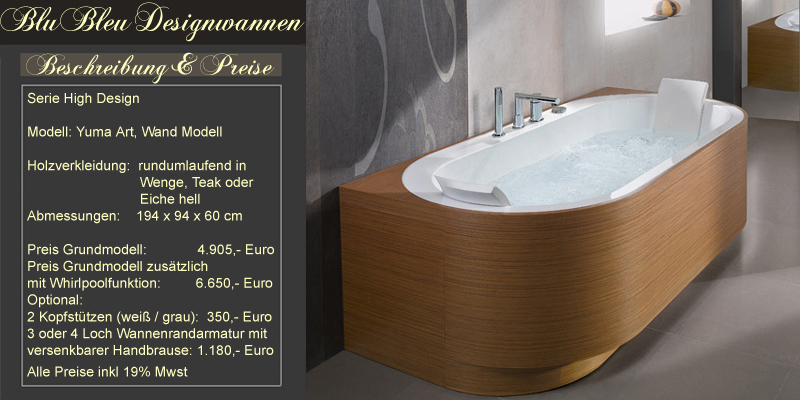 Für alle Modelle können Designwannenverkleidungen aus Holz, Leder oder in Hochglanz farbig lackiert geliefert werden. Durch die Kombination verschiedenener Badewannenmodelle und unterschiedlichsten Farben sind den gestalterischen Möglichkeiten keine Grenzen gesetzt. Die ergonomisch geformten Designwannen sind sehr bequem und werden perfekt durch die wechselbaren Kopfstützen aus Holz, oder Kunststoff ergänzt. Die farbig lackierten Umbauten sind in 96 verschiedenen Farben lieferbar, eine Pdf-Liste der verfügbaren Kopfstützen und eine Farbübersicht senden wir Ihnen gerne per Email.
