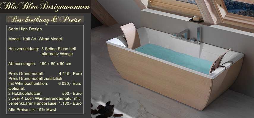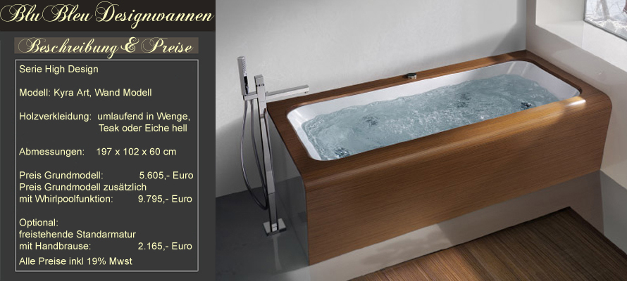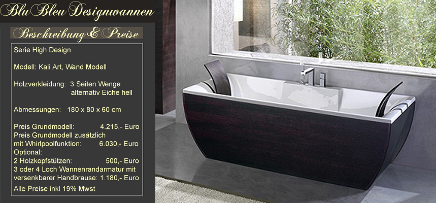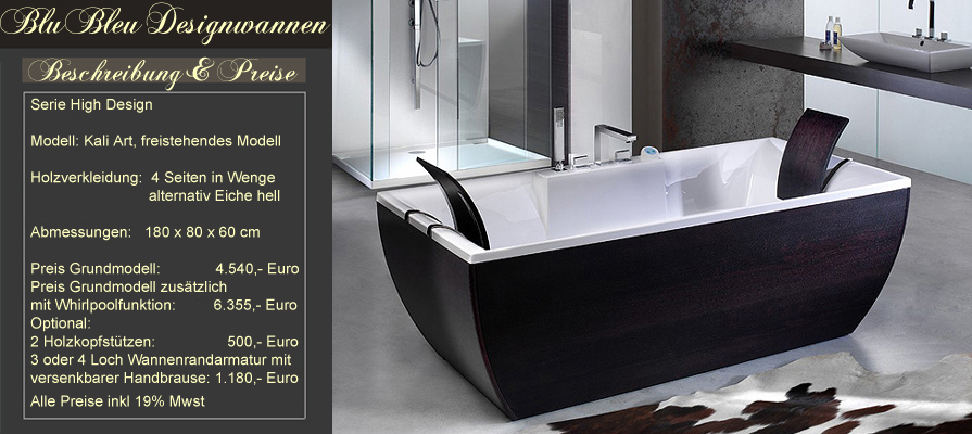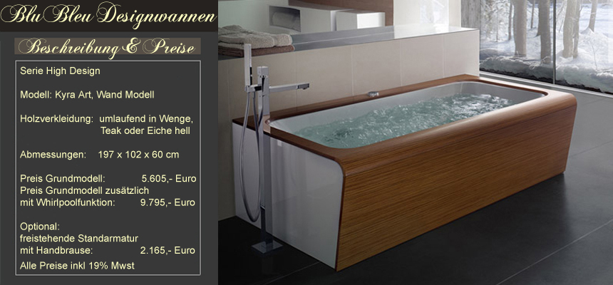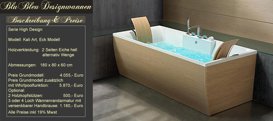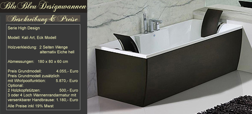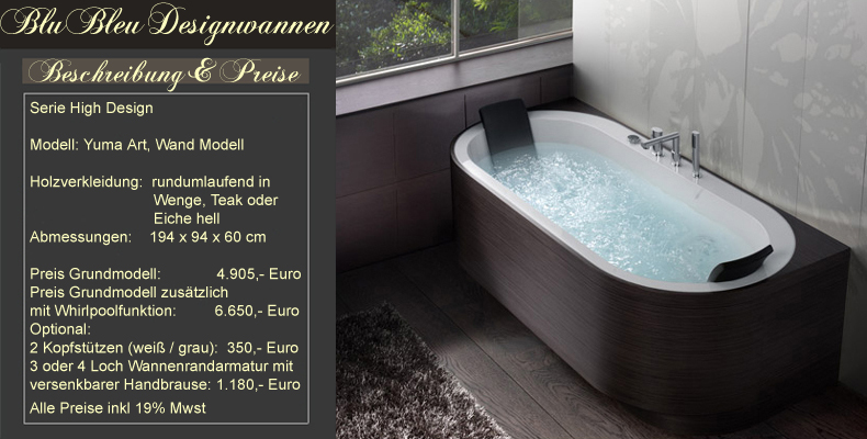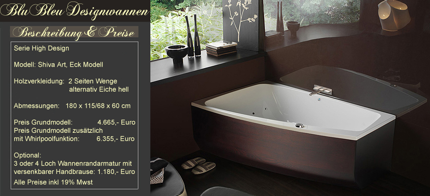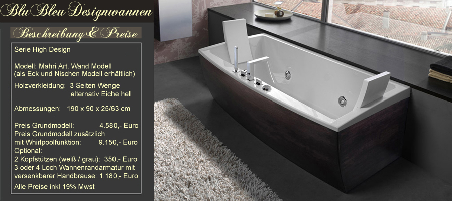 BluBleu ist unser Lieferant für exklusive Designwannen, die unsere modernen Waschtisch- und Möbelserien von Euro Bagno und Mobiltesino perfekt ergänzen. Nahezu alle Modelle der Designwannen sind in verschiedenen Versionen lieferbar, als Eckmodell, als freistehende Wanne, als Nischenmodell, oder als klassisches Wandmodell. Jedes dieser Modelle ist mit und ohne Whirlpoolfunktionen lieferbar. Der von uns angegebe Preis für die Whirlpoolfunktion ist für die High-End Ausstattung mit bis zu 12 Jet-Düsen und 6 Hydromassage-Düsen (Modellabhängig).