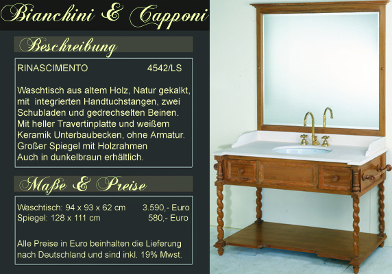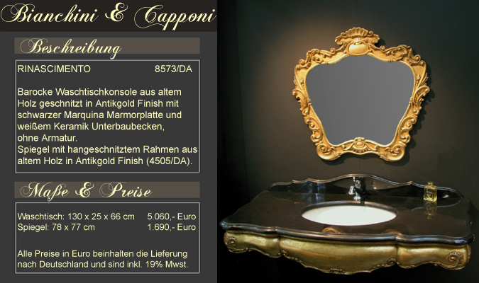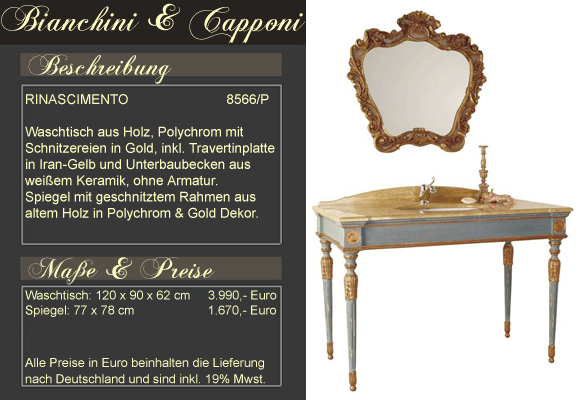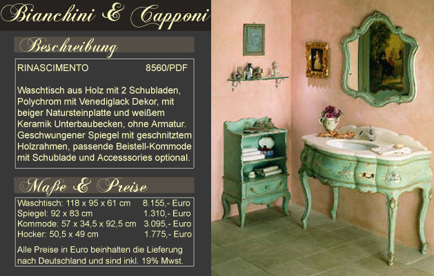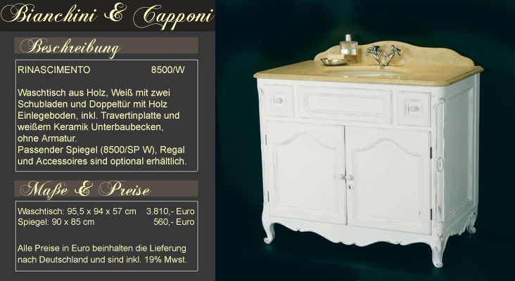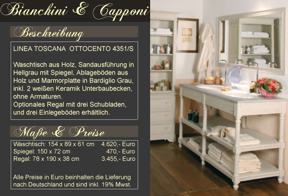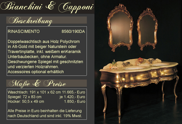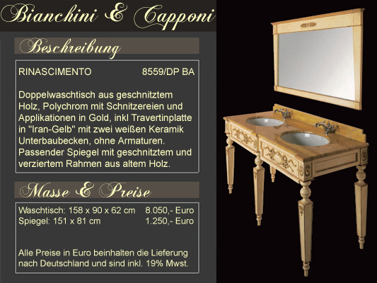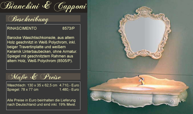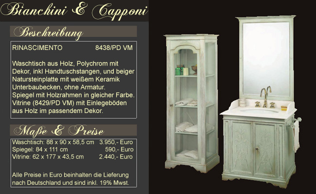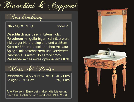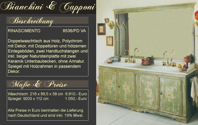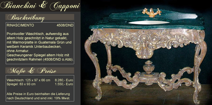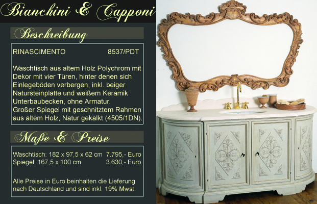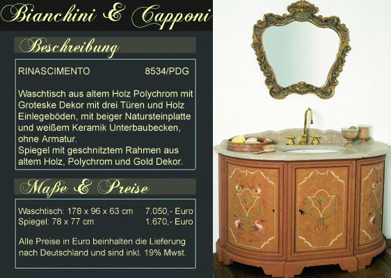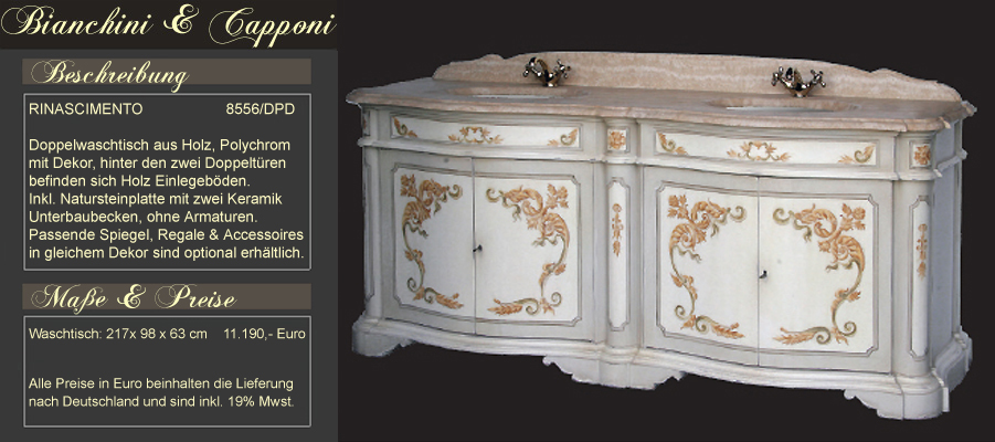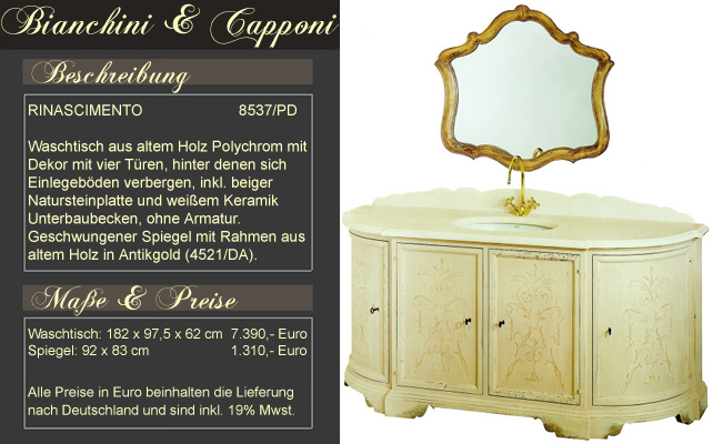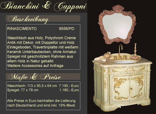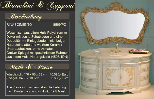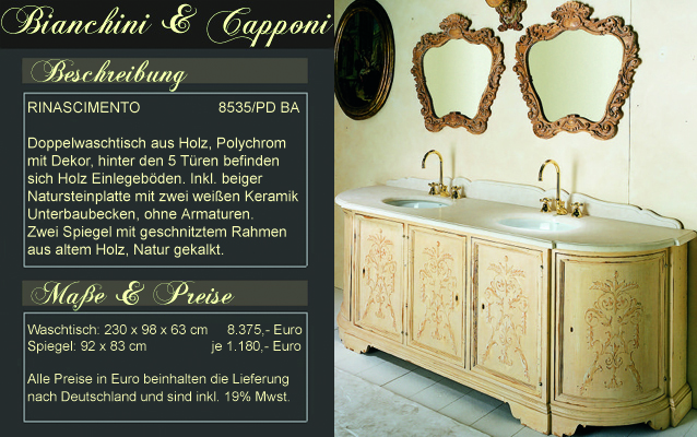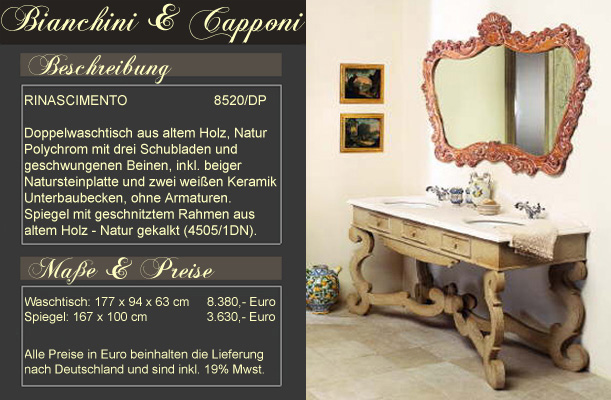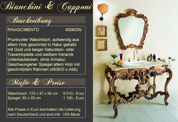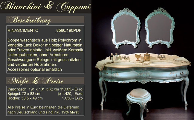 Bianchini & Capponi sind speziallisiert auf die Reproduktion alter klassischer Badmöbel aus allen Zeitepochen. Die Möbel werden aus alten Hölzern handgefertigt, aufwendig patiniert und gestaltet. Mit Ihrer Detailverliebtheit und einem Höchstmaß an Handwerkskunst und Originalität sind die handgearbeiteten Waschtische im oberen Preissegment unseres Angebots angesiedelt.