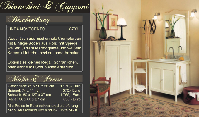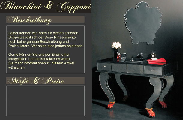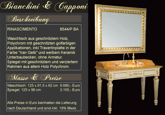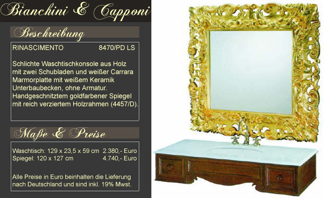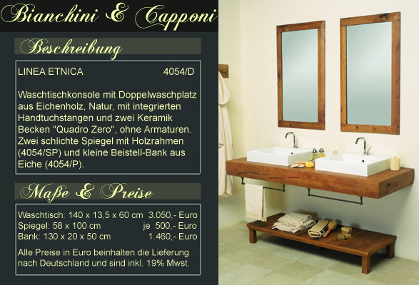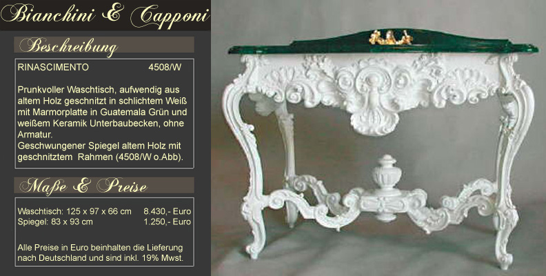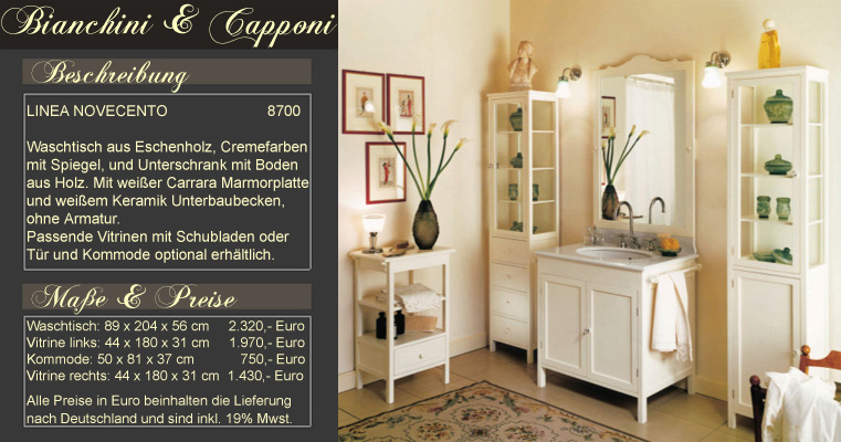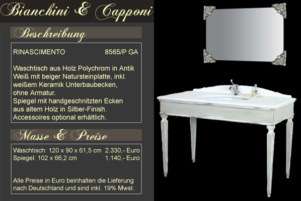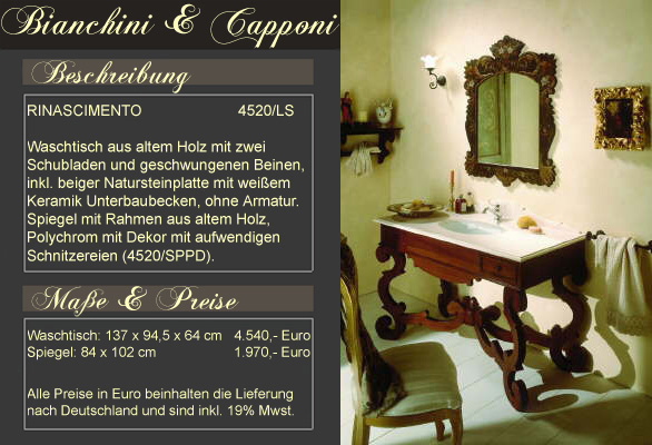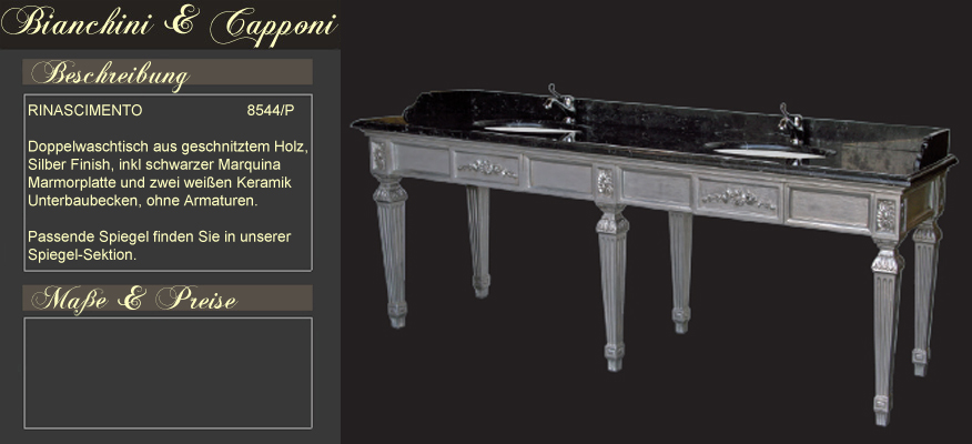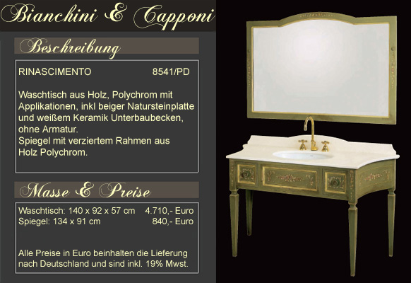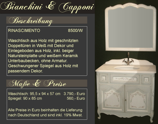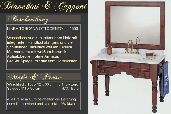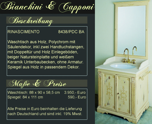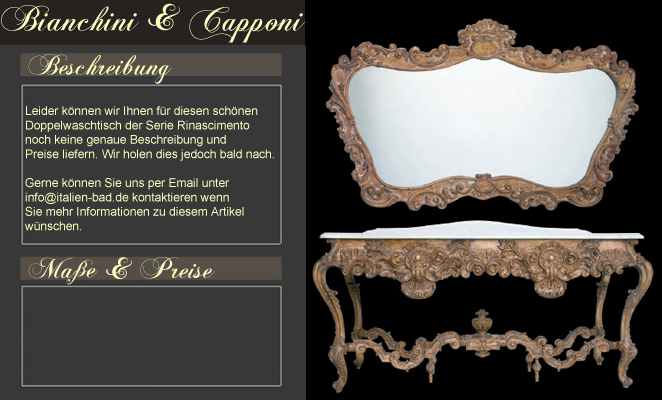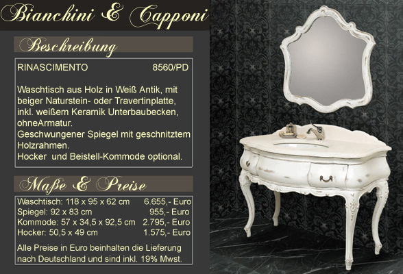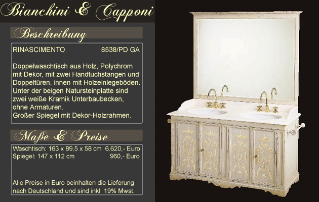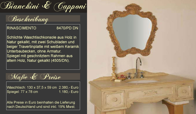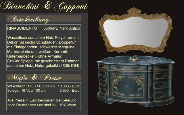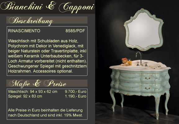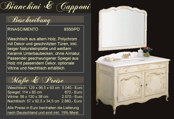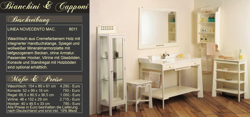 Bianchini & Capponi sind speziallisiert auf die Reproduktion alter klassischer Badmöbel aus allen Zeitepochen. Die Möbel werden aus alten Hölzern handgefertigt, aufwendig patiniert und gestaltet. Mit Ihrer Detailverliebtheit und einem Höchstmaß an Handwerkskunst und Originalität sind die handgearbeiteten Waschtische im oberen Preissegment unseres Angebots angesiedelt.