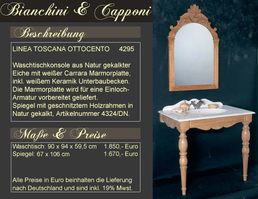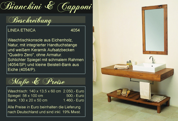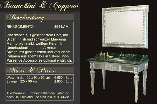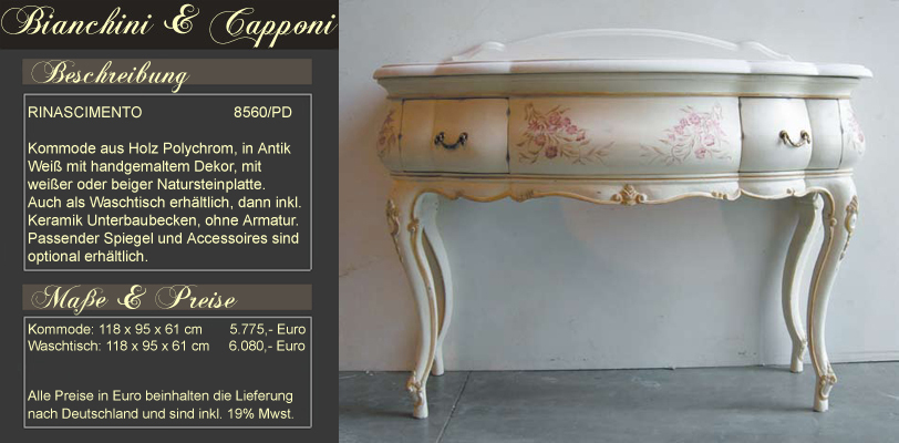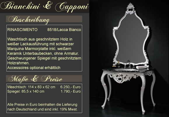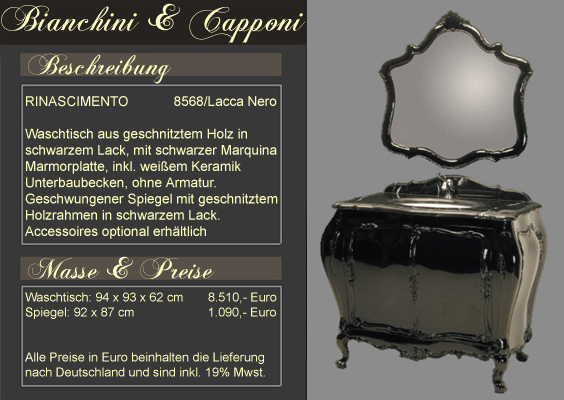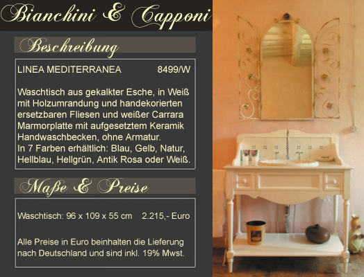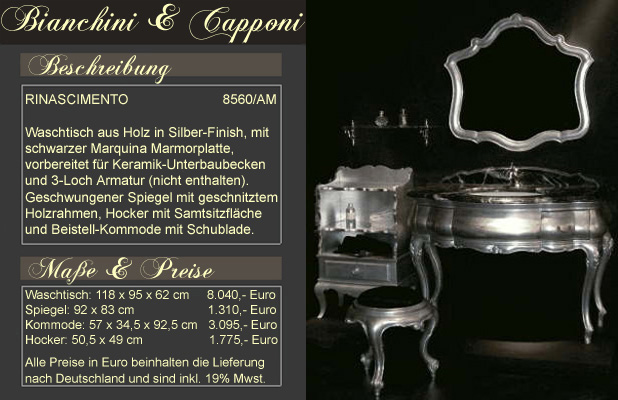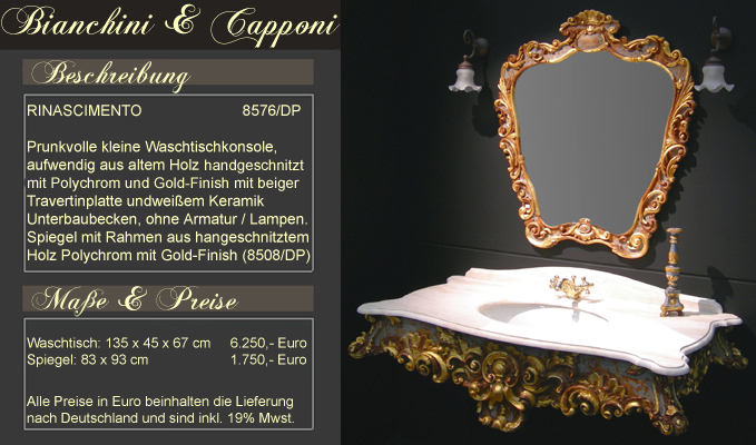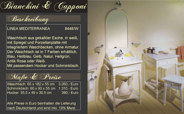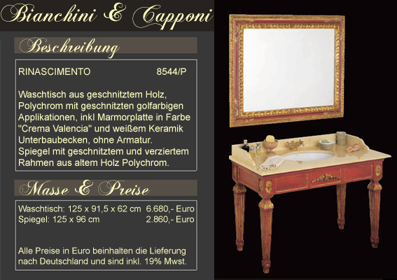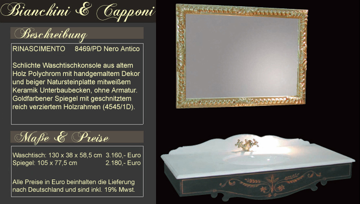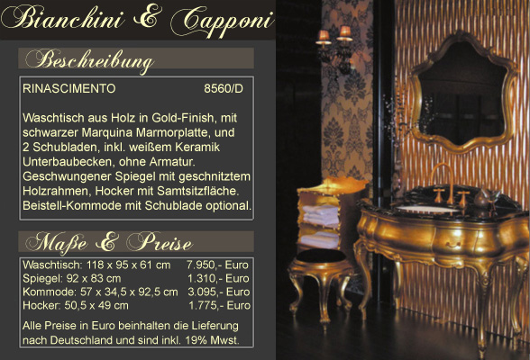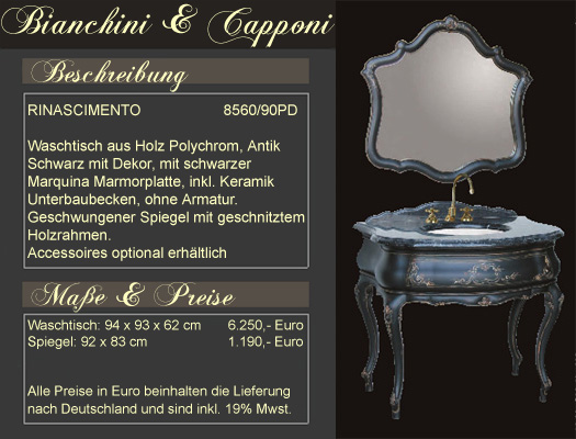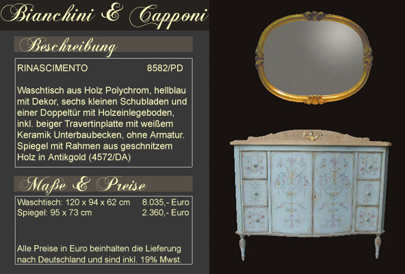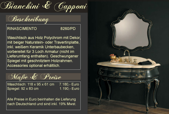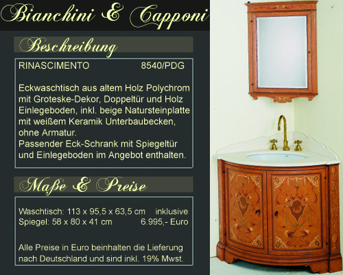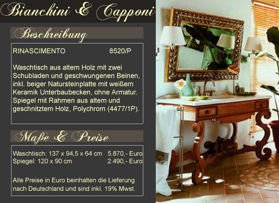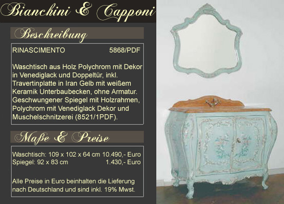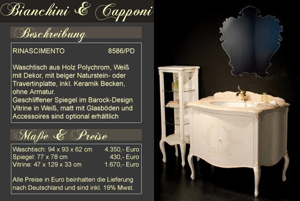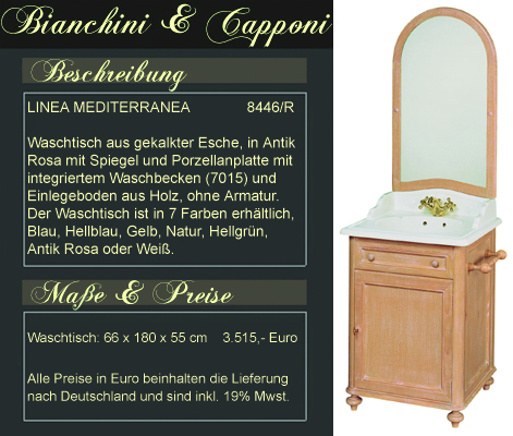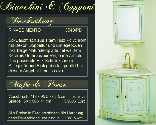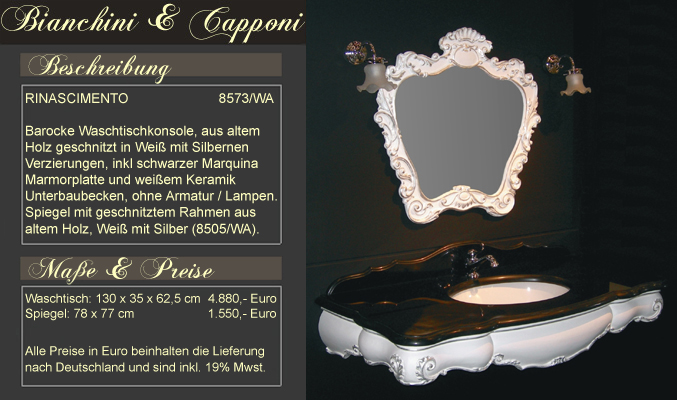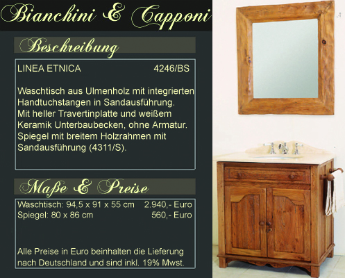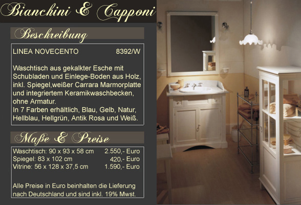 Bianchini & Capponi sind speziallisiert auf die Reproduktion alter klassischer Badmöbel aus allen Zeitepochen. Die Möbel werden aus alten Hölzern handgefertigt, aufwendig patiniert und gestaltet. Mit Ihrer Detailverliebtheit und einem Höchstmaß an Handwerkskunst und Originalität sind die handgearbeiteten Waschtische im oberen Preissegment unseres Angebots angesiedelt.
