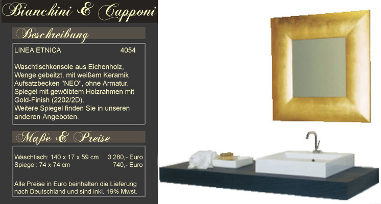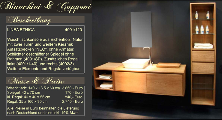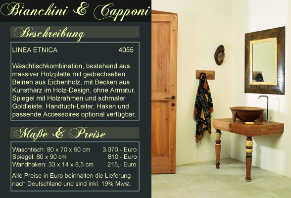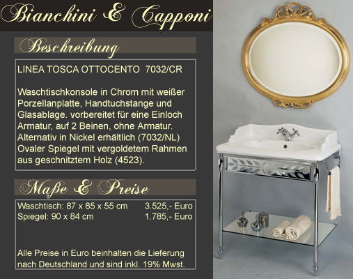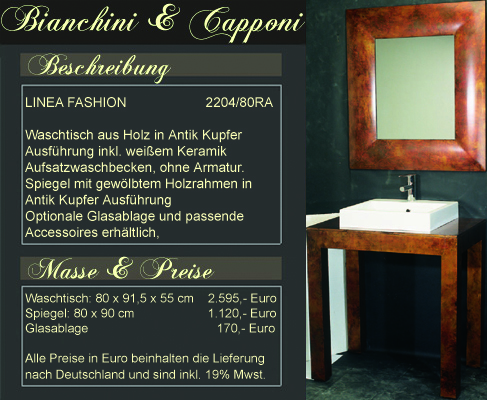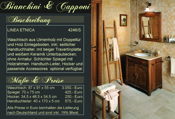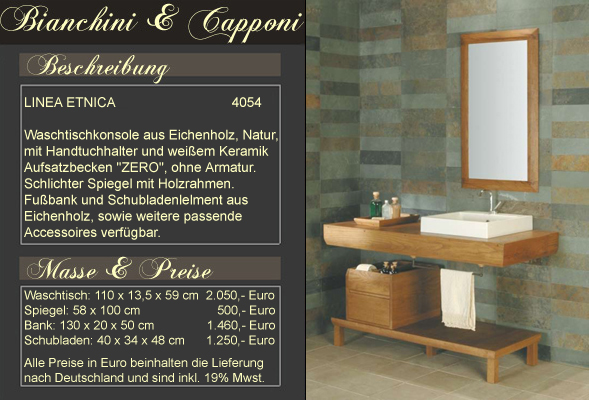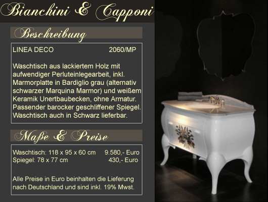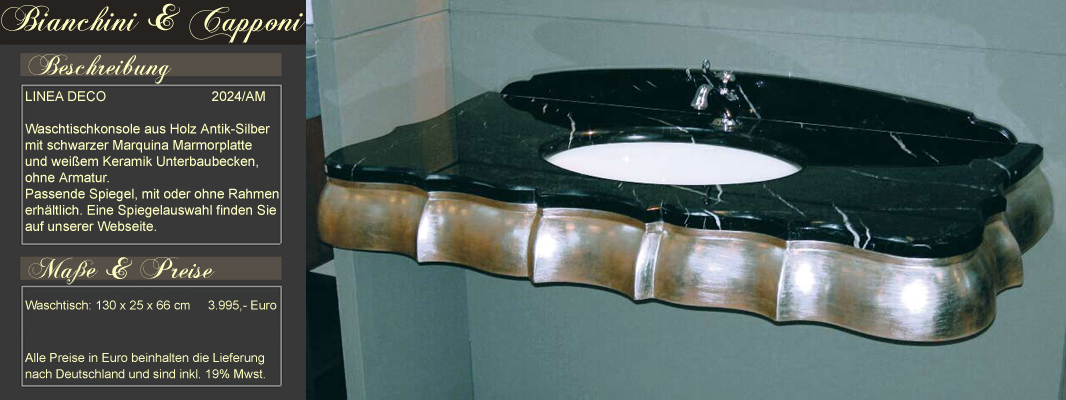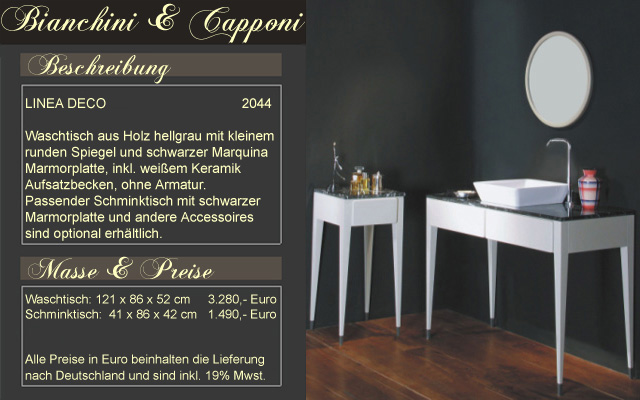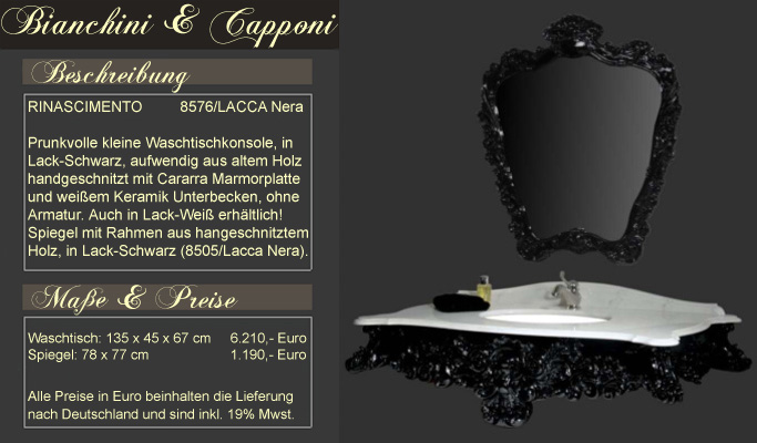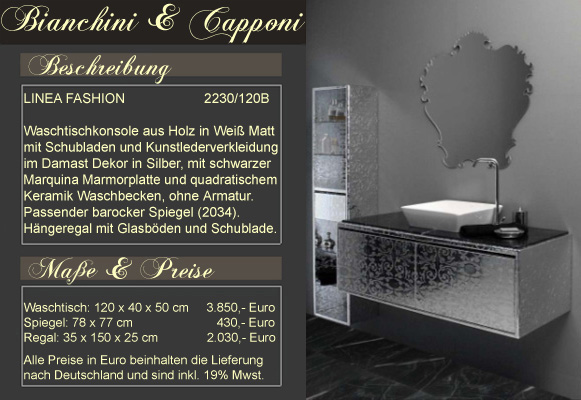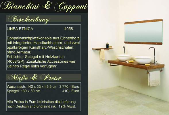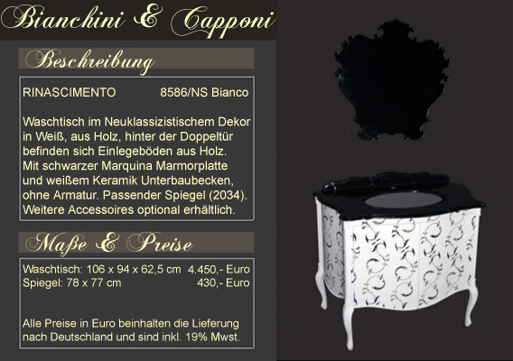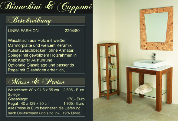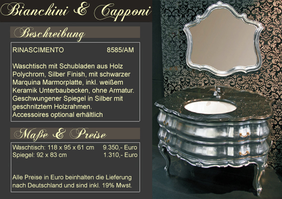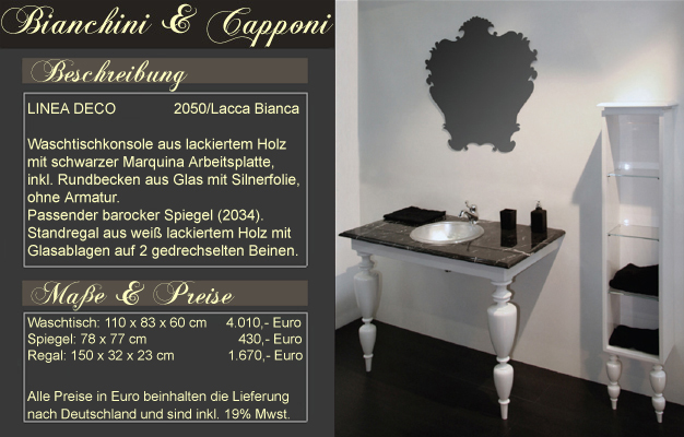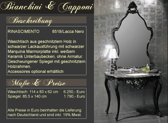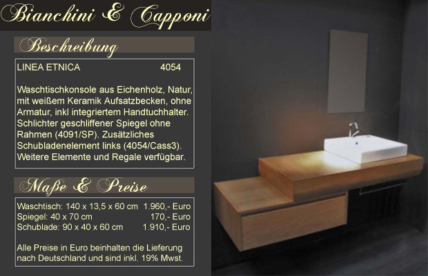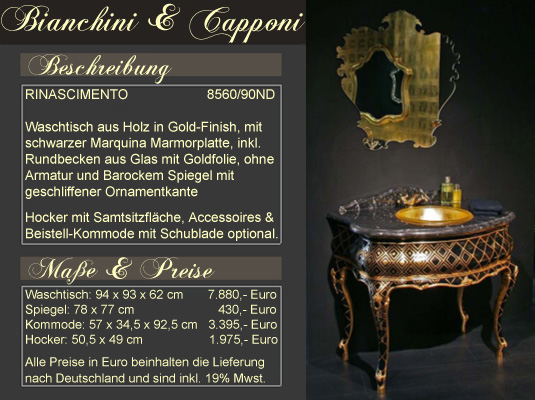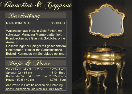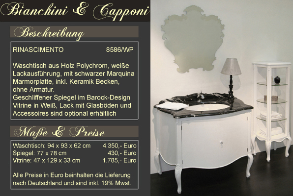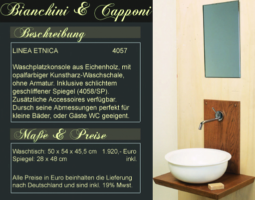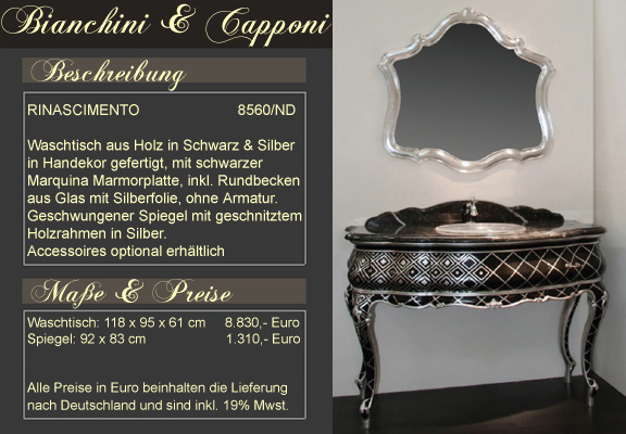 Bianchini & Capponi sind speziallisiert auf die Reproduktion alter klassischer Badmöbel aus allen Zeitepochen. Die Möbel werden aus alten Hölzern handgefertigt, aufwendig patiniert und gestaltet. Mit Ihrer Detailverliebtheit und einem Höchstmaß an Handwerkskunst und Originalität sind die handgearbeiteten Waschtische im oberen Preissegment unseres Angebots angesiedelt.