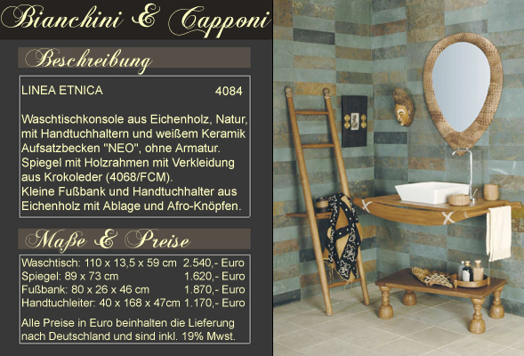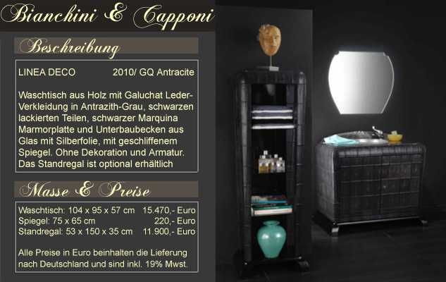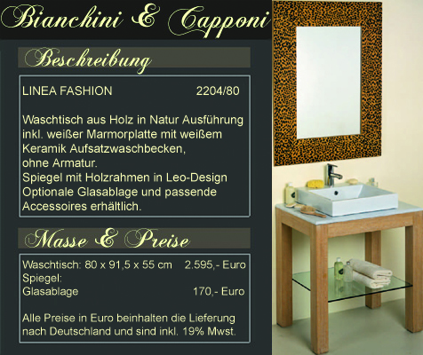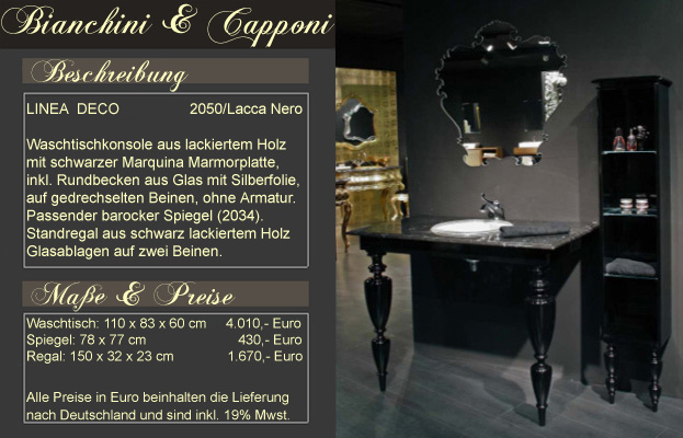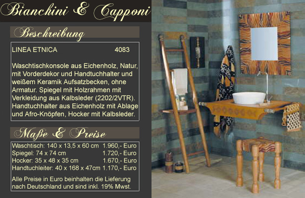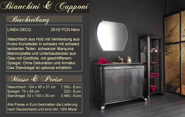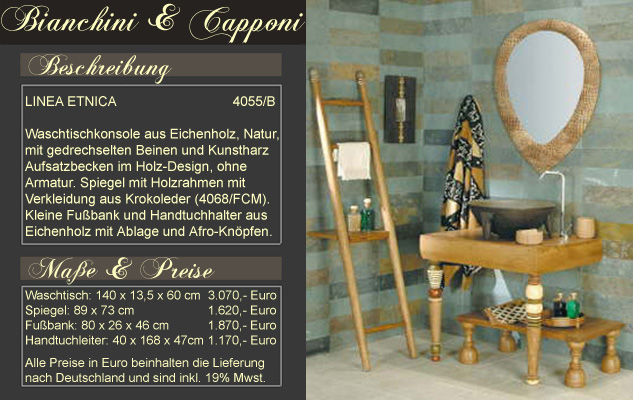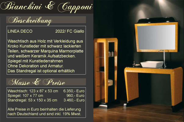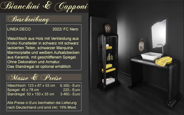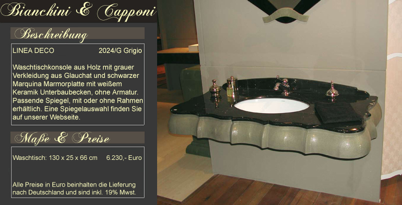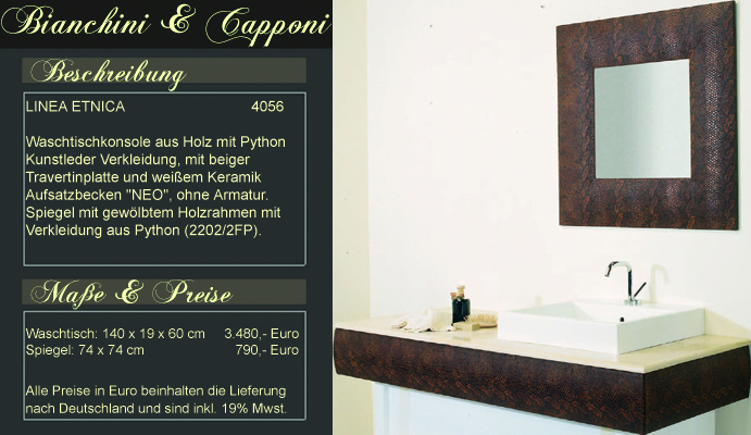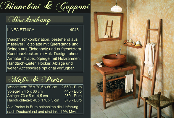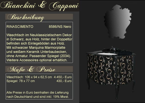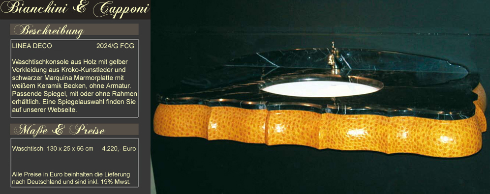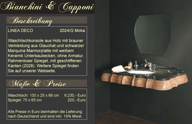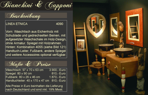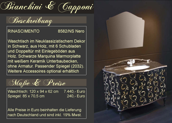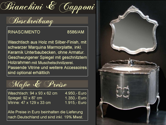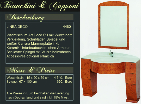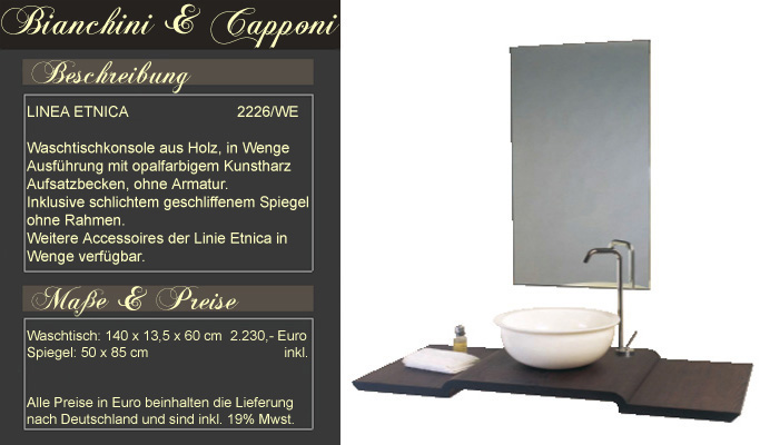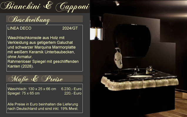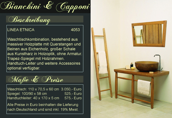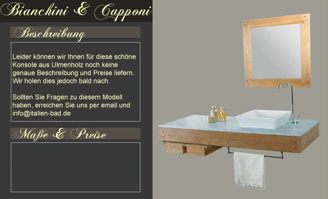 Bianchini & Capponi sind speziallisiert auf die Reproduktion alter klassischer Badmöbel aus allen Zeitepochen. Die Möbel werden aus alten Hölzern handgefertigt, aufwendig patiniert und gestaltet. Mit Ihrer Detailverliebtheit und einem Höchstmaß an Handwerkskunst und Originalität sind die handgearbeiteten Waschtische im oberen Preissegment unseres Angebots angesiedelt.